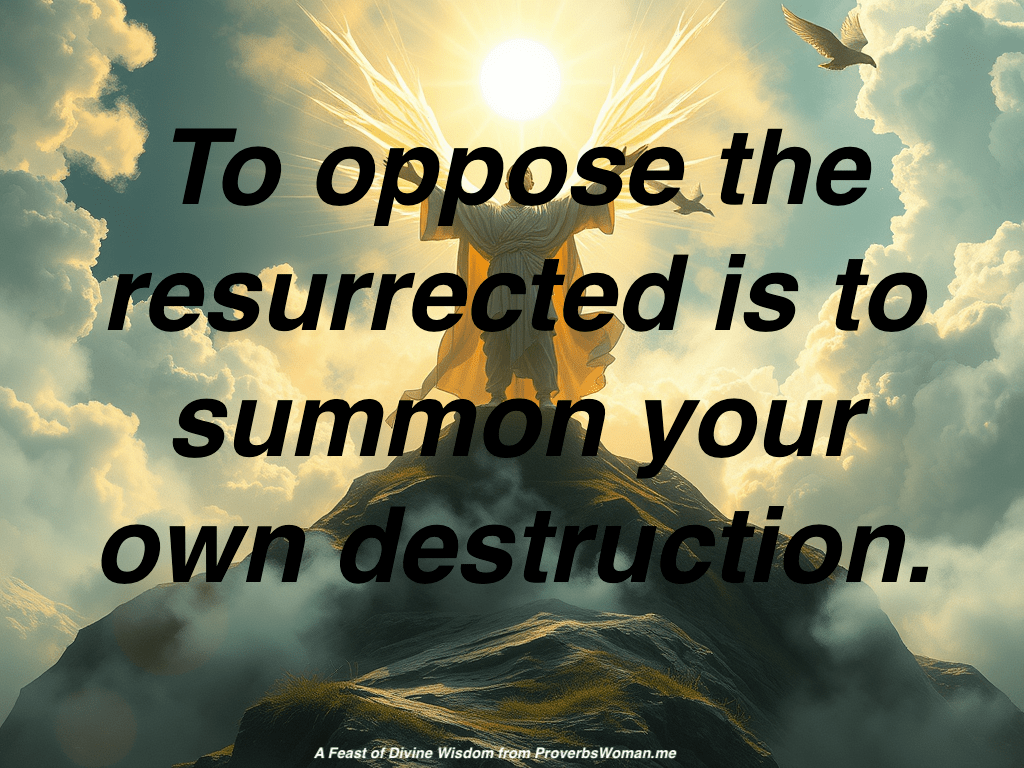 So do not attempt to oppose it. He will not die again, for death has no claim on him now. Every attempt to challenge him will only fuel a storm of justice and vengeance. It will not be his undoing but yours—a reckoning that will unleash hell upon the forces of darkness, consuming all that stands against the light. The resurrected does not falter, does not waver; he stands as an unyielding beacon, an immovable force, and a relentless protector of what is just and true.